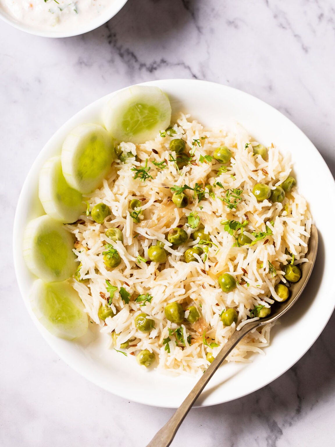 Enjoy peas pulao on their own as a side or main dish, or serve with nearly any condiments or sides. The peas and rice pair perfectly with creamy and cool yogurt sauces and dips, like onion tomato raita, cucumber raita or boondi raita.