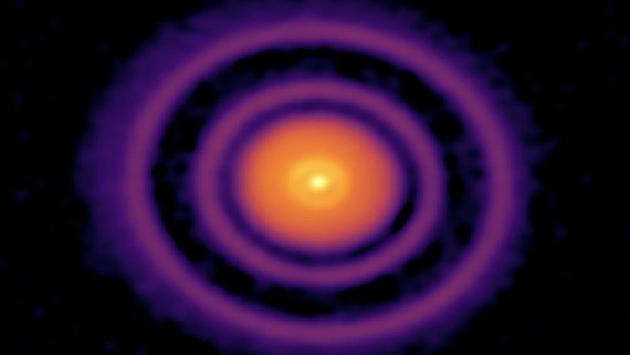 Science images from the research show (right) bloblike emissions of light coming from otherwise empty gaps in the highly structured, seven-ring disk around AS 209 (left). This indicates possible presence of an exoplanet.